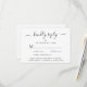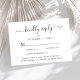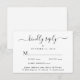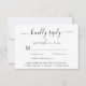 Elegant wedding RSVP enclosure card featuring "kindly reply" in a calligraphy script with swashes, simple and modern typography, personalized menu entree options and your names and wedding date joined together by a heart on the back.
