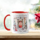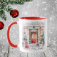 Christmas holiday mug featuring a watercolor illustration of a beautiful snowy front entrance decorated for the holidays with red bows, presents, garland and a wreath above vibrant red doors. A Merry Christmas greeting shown on the bottom right in a black Julietta font. The greeting can be changed to Season's Greetings, Happy Holidays, an individual's name, your own personal greeting or removed all together. Additional styles, sizes and rim and handle colors available. Image may need to be adjusted for varying sizes.