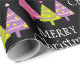 Wrap your Christmas presents for the holiday season in a unique way with this elegant and pretty gift wrap design featuring a pretty pink, purple, and green tree pattern with white “Merry Christmas” text on a black background.