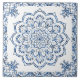 Delicately decorated ceramic tile in Indian mandala theme, white and metallic blue colors.
