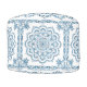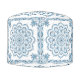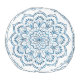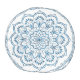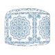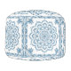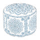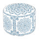 Delicately decorated round pouf in Indian mandala theme, white and metallic blue colors.