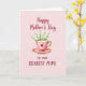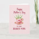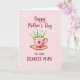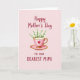 This card shows a soft rosy-pink background that sets a gentle, affectionate mood ❤️. At the center sits a pastel pink teacup used like a vase, with a tender little red heart on its side as a sweet sign of care. The cup has thin gold edging along the rim, handle, and base, and it rests on a matching saucer with the same golden accents. A full bouquet of small white, bell-shaped flowers rises from the cup, tucked among fresh green leaves that suggest a calm spring morning 🌼. Near the top, the phrase “Happy Mother’s Day” is placed in a flowing, decorative lettering style in a deep red tone that echoes the heart on the cup. Below the flowers, “TO OUR DEAREST MIMI” appears in uppercase letters, centered and set in a simpler style that feels steady and affectionate. The gold trim catches the eye in tiny highlights around the cup’s rim and along the saucer’s edge.