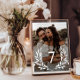 These personalized wedding table number cards are the epitome of romance and elegance, designed to add a personal touch to your wedding reception décor. Each card features a dual-sided design, allowing you to showcase a cherished photo of you and your partner on each side, capturing the joy and love that mark this special occasion. The front side displays one of your beautiful engagement photos as the backdrop, with the table number prominently displayed in a sophisticated font, surrounded by a delicate laurel wreath. The laurel adds a classic symbol of victory and celebration, perfectly encapsulating the triumph of your love story. On the reverse, another photo offers guests a glimpse into your journey together, making every table not just a place to dine but a showcase of your unique bond. This gives guests a wonderful conversation starter and a more intimate connection to the happy couple. The clean and stylish design ensures that they complement any wedding theme, from rustic to modern chic. They are easily visible without being obtrusive, allowing guests to smoothly navigate to their assigned seating. These table number cards are not just functional; they're keepsakes that you and your guests will cherish long after the wedding day.