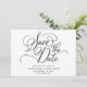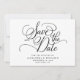 Announce the wedding date and location with these elegant Save The Date cards. Design features calligraphy script ''save the date'', names, date and location, website.