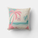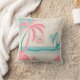 This tropical throw pillow features a minimalist yet vibrant design with pastel pink and teal palm trees set against a serene beach and ocean background. The artwork emphasizes smooth, clean lines, with the curved shapes of the trees complementing the calm waves and clouds in the sky.