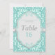 Elegant Mint and Grey Table Number Card. Created with seafoam green, aqua & grey with an antique lace style, this design is great for elegant and traditional style weddings. Additional coordinating wedding supplies are available at MetroEvents on Zazzle.