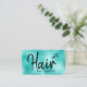 This modern hairstylist business card design features scissors, faux mint blue metallic texture background and elegant calligraphy font.