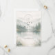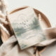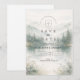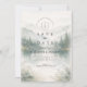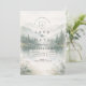 A serene and atmospheric design inspired by misty mountain landscapes and quiet forest scenery. Soft watercolor layers of pine trees and distant hills fade gently into the background, creating depth and a calm, romantic mood. The muted palette of sage green, cool grey, and soft ivory gives the design a refined, nature-driven elegance—perfect for couples drawn to minimalist aesthetics and intimate outdoor celebrations.