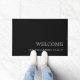 This simple and modern black doormat says "Welcome" in classic, elegant light gray text and has room for your family name or business name.