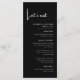 The Elegant & Modern Black and White Let's Eat Wedding Menu adds a stylish and polished touch to your reception, guiding guests through the dining experience with sophistication. Featuring a timeless monochrome design that blends classic elegance with contemporary minimalism, this menu card complements a variety of wedding themes, from formal black-tie dinners to chic modern celebrations. Printed on premium-quality cardstock with crisp, easy-to-read typography, it not only highlights your carefully chosen dishes but also enhances the overall table setting. More than just a practical detail, this wedding menu creates a cohesive and refined look that leaves a lasting impression on your guests.