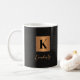 Stylish modern luxury monogram initial and signature script name personalized coffee mug featuring a faux metallic gold copper square with initial letter and your name over a black leather like (PRINTED TEXTURE) background.