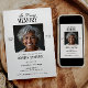 Elegant black and white memorial service invitation template featuring a modern minimalist layout, perfect for honoring a loved one with timeless style. This design showcases a centered photo paired with classic serif typography for the name and dates, and delicate cursive accents for a personal touch. The simple black and white color scheme lends a refined and dignified tone suitable for funeral announcements or celebration of life ceremonies. Ideal for those searching for customizable memorial invitations with a clean, professional aesthetic, this template includes space for one featured photo and clear event details in an easy-to-read format. Available as printed cards or an instant digital download.