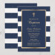 Elegant blue striped baptism invitation showcasing a gold cross, a frame and little stars.