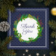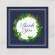 Thank You text. An elegant and modern navy blue winter themed watercolor illustration of a Christmas wreath decoration with mistletoe, holly and pine. Text to personalize.