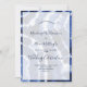 This unique, modern, artistic design features a dark navy indigo blue and white shibori geode tie dye watercolor pattern resembling agate, marble, or ocean waves washing up on a beach. In the center on the front are all the wedding details in elegant, trendy calligraphy script and sans serif typography on a partially transparent white overlay that lets the marbled pattern show through. You can personalize this item by changing the customizable text in the product template.