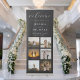 Create your own personalized wedding welcome sign banner with your personalized photo collage, elegant calligraphy script typography and modern minimal black and white design.