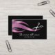 Beautiful hairstylist business card design with purple faux metallic texture hair, scissors, black background and elegant calligraphy font.