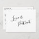 Simple black and white wedding postponement announcement postcard with, "Love is Patient" in an elegant handwritten script on the front. The backside has your personal message and return address for easy mailing. The chic hand lettering adds a romantic touch to this minimalist design. A modern announcement postcard that is great for letting your guests know that your wedding has been postponed.