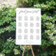 Elegant Black & White Calligraphy Wedding Seating Chart: This wedding seating chart has up to 14 tables of 10 guests plus a header table. It features an elegant black and white modern calligraphy script at the top. Enter your guests names and your table numbers. You can delete and move around tables.