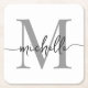 Girly Elegant Modern White and Gray Monogram Initial Name Signature Script Custom Personalized Square Paper Coaster. This design featuring your first name in a pretty hand lettered style swash tail font typography (or calligraphy) with monogram initial in black and gray on white. Easy to customize it. Great stylish feminine housewarming gift, also for birthday, mother’s day, wedding, bridal shower, sweet 16 birthday party, baby shower, for graduation party and It’s for the girl who loves unique simple minimalist things.