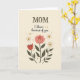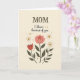 This card features a soft, light cream background with a calm, minimal layout that feels like a quiet thank-you ❤️. Near the top, the word “MOM” appears in large, dark brown, simple lettering, centered and easy to read. Directly beneath it, the phrase “I bloom because of you” is placed in a smaller, flowing style in matching dark brown, giving the lines a gentle, affectionate rhythm. Below the text, a cluster of stylized flowers and leaves fills the lower half, arranged so the stems seem to lean toward each other like close companions. A layered blush-pink flower sits near the center, paired with a deeper red bud nearby, suggesting a tender bond growing side by side 🌼. Small sunburst shapes and scattered earthy brown dots are tucked around the blooms, adding light visual sparkle without crowding the design. Deep olive-green leaves with lighter veins extend from thin stems, framing the flowers across the bottom portion of the card.