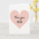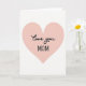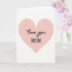 This card features a large pastel pink heart centered on a bright white background, creating a soft, affectionate focus ❤️. Inside the heart, the words “Love you” appear near the upper middle in flowing black lettering, like a gentle note shared between close hearts. Just beneath it, “MOM” is set in uppercase black letters, slightly larger and steadier, giving the message a strong anchor. The contrast between the smooth, curving “Love you” and the firm, straight “MOM” adds a tender balance, like a warm hug paired with reassuring strength. With lots of open white space around the heart, the design feels calm and uncluttered, letting the message breathe. The pale pink tone keeps the mood sweet and caring, like a quiet moment shared over flowers 🌼. The heart’s rounded edges sit evenly in the center, with the black text neatly aligned inside its shape.