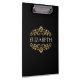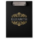 An elegant black and gold flourish clipboard for your office or back to school. Add your name between the gold floral flourish on the front, and your initial on the back. Designed for you by Blackberry Boulevard.