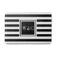 Elegant personalized initials monogram bath mat featuring a black and white striped pattern with your initials set in a black bordered square with a classic white text. Designed by Thisisnotme©