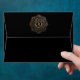 5x7 black envelope in elegant, bohemian style. Beautiful floral mandala that looks like gold foil adorns the back top flap. Monogrammed initial in gold hue, which font style may be changed, is centered on a black and shiny gold effect circle. Note: Image is printed. Not actual foil or metallic. Elegant envelopes for Art Deco theme wedding invitations or black and gold engagement announcements, milestone birthdays, gold graduation parties, chic bridal showers, sophisticated anniversary parties, and other formal occasions.