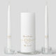 Simple, elegant, personalized wedding unity candle set decor, with names of bride and groom, faux gold rope heart and modern calligraphy script.