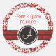 Elegant Monogram Damask Save The Date Wedding Stickers. Make a lasting impression with this Elegant Monogram Damask Save The Date Wedding Stickers . There is a stripe along the sticker and a circle with an elegant monogram on it. The beautiful red and white damask pattern background adds style and finesse. Designed by Olympia. Classic and sophisticated yet contemporary at the same time. Design available in several colors. Personalize it with your text. You can change text and use it as Thank You stickers or any other use you think.