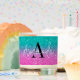 Trendy deep pink to turquoise gradient, glitter texture background, custom name, and one letter monogram.