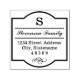Design features an elegant decorative frame design with monogram initial and custom return address text and scroll accent.