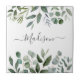 Bring nature indoors with this elegant ceramic tile! Featuring eucalyptus and tropical leaves with a custom script monogram, it's suitable for greenery lovers.