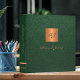 Luxury exclusive looking monogrammed scrapbook wedding album binder featuring a faux gold copper metallic square over a stylish dark green faux leather background.