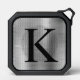 Modern bluetooth speaker featuring your monogram initial in elegant typography on a brushed silver faux metallic background.