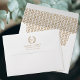 Elegant wedding envelopes featuring a simple laurel wreath framing the couple's initials. Inspired by 1920s design, it blends classic formality with modern flair, using a traditional serif font, and matching leaf pattern printed inside. You can personalize the template with the couple's names, monogram, and return address — all the text can be customized to suit your occasion. Perfect for invitations, save the date cards, bridal showers, rehearsal dinners, or personal stationery. Printed colors: gold and white. Shop the collection for matching stationery and supplies for sale online!
