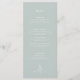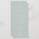 This wedding menu card features a stunning light silvery sage green color with crisp white font. The minimalist monogram with a line art drawing of a leaf adds a touch of natural beauty and sophistication to the overall look.
