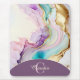 A feminine elegant liquid ink design in pink, purple, turquoise and gold. Personalized with monogram and name.