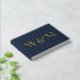 Elegant dark navy blue wedding guest book featuring your choice of real gold, silver or rose gold foil, your monogram initials in large classic serif typography, your first names and your wedding date. Add a title on the spine.
