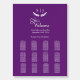 Adorning the majestic purple background is delicate white script typography, meticulously crafted to exude grace and charm. The elegant curves and flourishes of the script add a touch of whimsy to the chart, while ensuring clarity and readability for guests as they locate their tables.