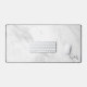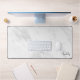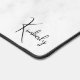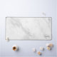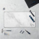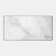 Elegant monogram desk mat featuring your name in a stylish thin signature script on a white and grey faux marble background.