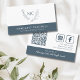 Elegant Monogram Wreath Neutral Slate Gray Business Card with Slogan... The front of our unique business card features an elegant botanical wreath bordering your two monogram initials in slate gray ink on a white background. Your name and title (or company name) appear in white ink on a neutral slate rectangle bordering the bottom of the business card, giving an authoritative structure to balance the delicate leafy wreath. On back of the card are your phone number, social media contact info, website address and QR code linking to additional information. The slate gray section on bottom contains your business motto or tagline. Example text currently shows "Always take the high road" in white script typography. If you prefer, you can delete the text for the motto. All text and the QR code can be easily revised on the personalization template.