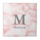 The ceramic tile has a lovely faux pink marble pattern. There's a large gray monogram above display text that can be edited to add custom text like a name.
