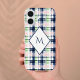 Personalize Your Phone with Preppy Flair! This stylish phone case features preppy plaid brushstrok pattern in navy blue, pink, and green, accented by an elegant custom monogram in a diamond frame. Protect your phone while showcasing your unique style.