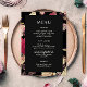 Beautiful moody floral pattern classic wedding menu features a lovely vintage look botanical pattern of red and pink flowers on an elegant black background