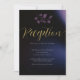 A few branches of eucalyptus leaves, hand-drawn in color pencil and layered with shades of dusty and dark purple, make for a modern, sophisticated, elegant yet chic wedding enclosure card. The black and dark blue background with hints of purple and lights illuminate the midnight sky. The elegant calligraphy script, in the hue of gold, makes this stylish black and purple design even more elegant.