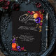 Embrace the opulent beauty of a fall floral harvest with our captivating wedding program. A dramatic, yet soft black background provides the perfect canvas for a breathtakingly realistic bouquet. Imagine a vibrant explosion of color, featuring roses in orange and dark magenta, with small magenta pink flowers and purple violets and alongside peach mums and other vibrant florals. Lush, dark green foliage completes the arrangement, adding a touch of natural elegance. An elegant, vintage script announces your card, while your wedding details are in a clean, modern font. This captivating design is perfect for any season, reflecting the passionate intensity of your love story. This enchanting design creates a truly unforgettable invitation to celebrate your special day. Created by Simply Farmhouse Press.