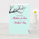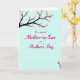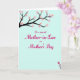 This greeting card features a calm, springlike scene with a bare tree branch curving in from the upper left, dotted with many soft pink, five-petaled blossoms with tiny yellow-orange centers 🌼. A small white bird rests on one of the higher twigs, its quiet posture adding a gentle, caring mood, like a tender pause between loved ones ❤️. The background is a smooth, pale blue that keeps everything airy and open. Centered on the front, a short message is written in bright fuchsia lettering, standing out clearly against the cool backdrop. The text sits neatly in the middle, with the branch and blossoms framing it from above and to the left. The overall layout feels balanced and affectionate, with the bird and flowers guiding your eye toward the words. In the lower right corner, a single stylized fuchsia flower blooms upward as a small finishing detail.