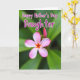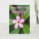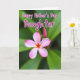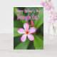 This greeting card features a large five‑petaled flower filling the lower portion, its petals fading from deep fuchsia at the edges to creamy white near a glowing orange‑yellow center. A small pink bud sits close by, leaning in as if keeping the bloom company, adding a gentle, affectionate touch ❤️. Behind them, the background stays softly blurred in green tones, suggesting leafy plants and giving the foreground a tender, intimate focus. Across the top, the message “Happy Mother’s Day Daughter” is placed prominently in flowing lettering. The words appear in bright fuchsia with a thin white outline, standing out clearly against the muted greenery. Soft light falls across the petals, making the color transitions look smooth and romantic, like a quiet moment shared between loved ones 🌼. The open flower rests slightly off-center near the bottom edge, with the bud tucked beside it against the green, out-of-focus foliage.